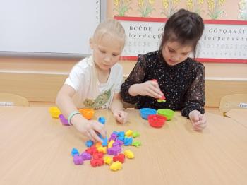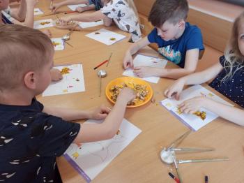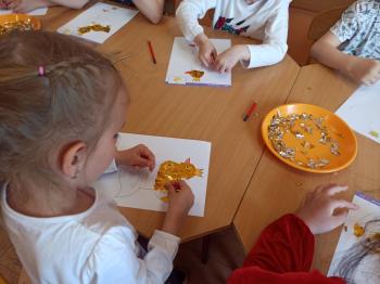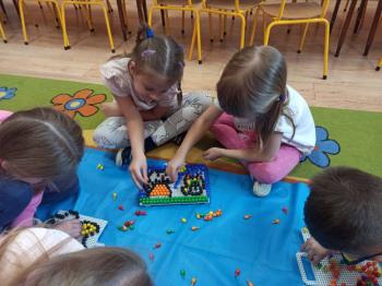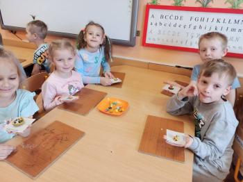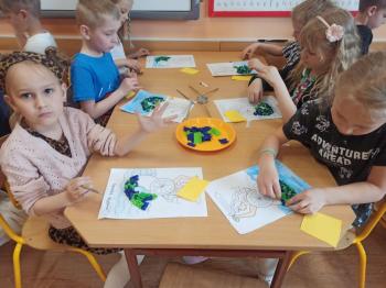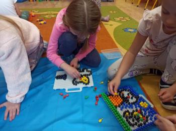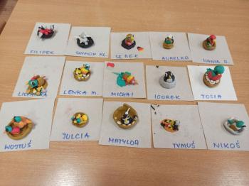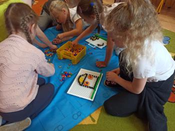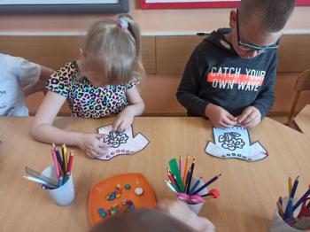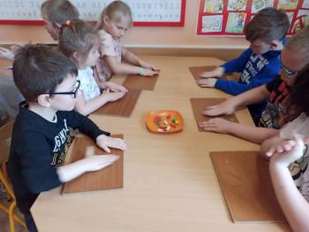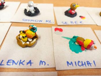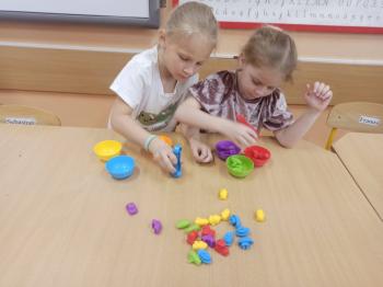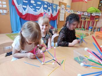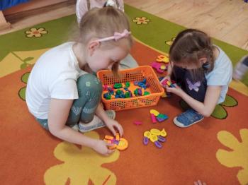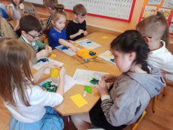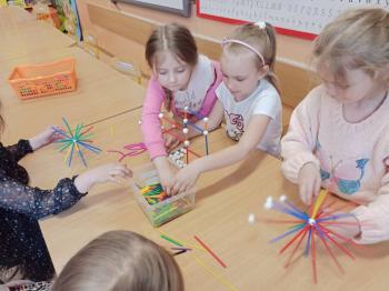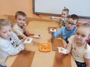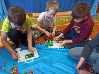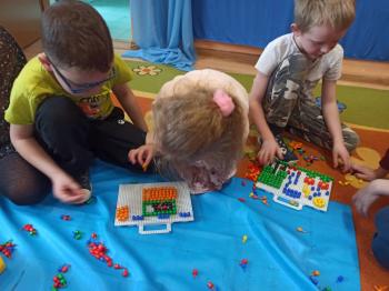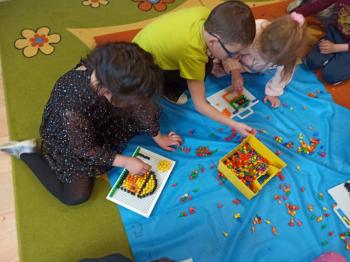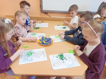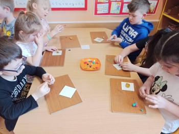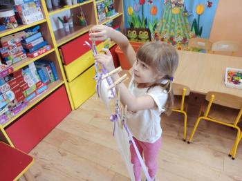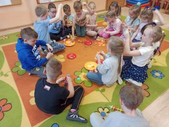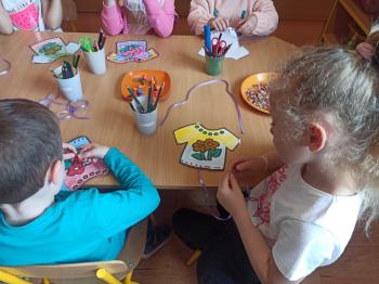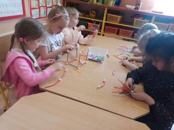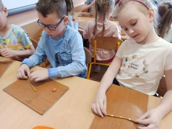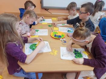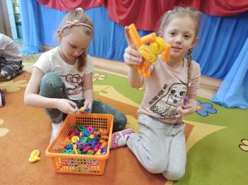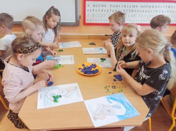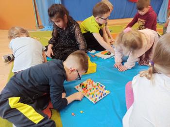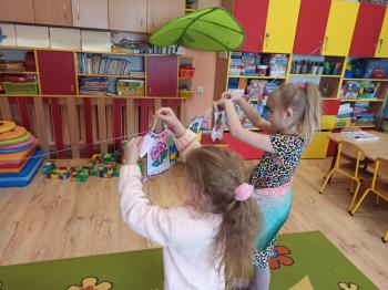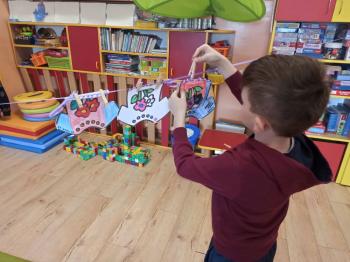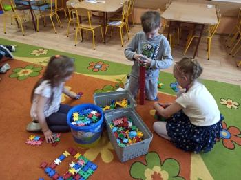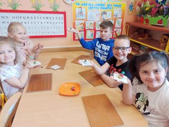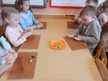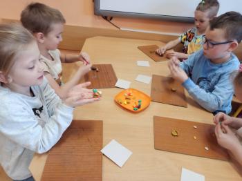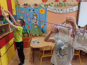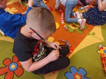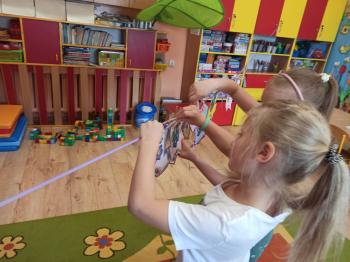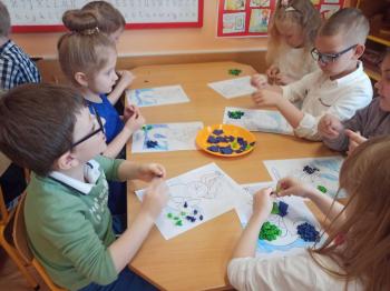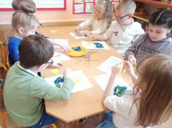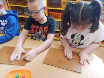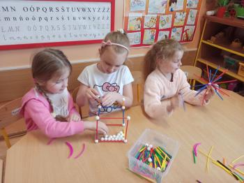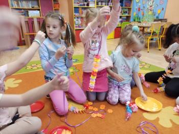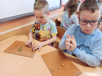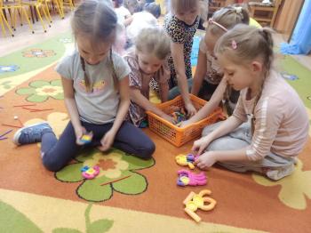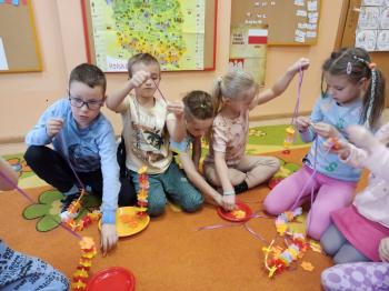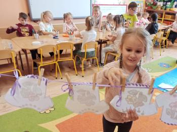 Kwiecień był miesiącem, w którym zajęcia prowadzone w ramach realizacji projektu edukacyjnego "Terapia ręki dla każdego" ukierunkowane były na czynności manipulacyjne. Dzieci uczestniczyły w zabawach i zajęciach wymagających nawlekania, przewlekania, formowania kształtów z mas plastycznych, z bibuły, papieru, konturowania z różnego rodzaju klocków, zbierania chwytem pęsetkowym drobnych elementów, przenoszenia elementów z wykorzystaniem pęset, posługiwania się klamerkami. Były zabawy paluszkowe, przekładanie, zakręcanie, owijanie. Wszystkie te działania usprawniają motorykę małą, rozwijają prawidłowy chwyt i właściwe napięcie mięśniowe, kształtują koordynację wzrokowo - ruchową. Rozwijają sprawności niezbędne do podjęcia nauki pisania.