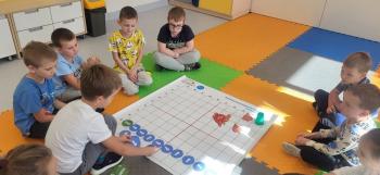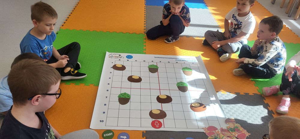 "Zbieramy dary jesieni" to kolejna propozycja zabawy z wykorzystaniem maty do kodowania, symboli darów jesieni oraz strzałek kierunkowych w grupie Kotki. Dzieci w dalszym ciągu uczyły się ukladać skrypt do postawionego warunku w zadaniu do wykonania. Zebrane dary jesieni podczas zabawy sprawiły dzieciom wiele radości.