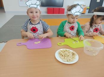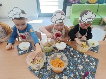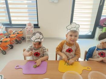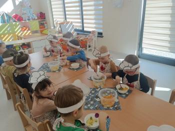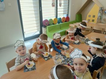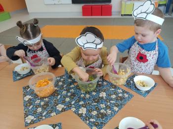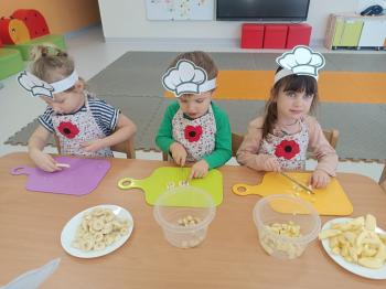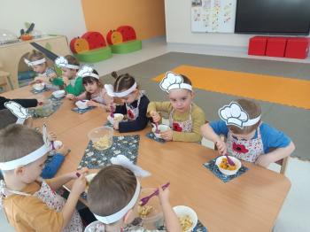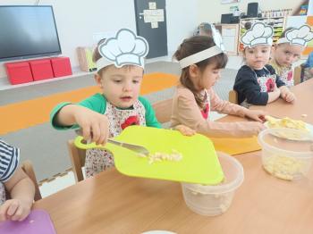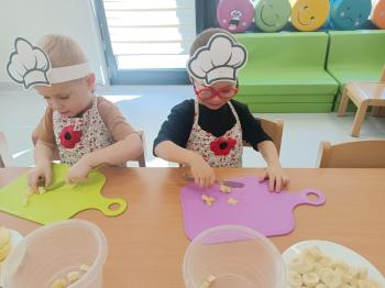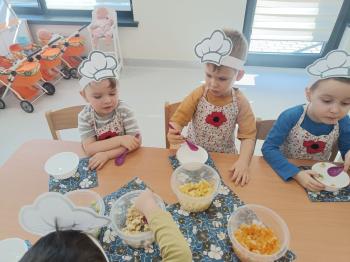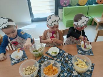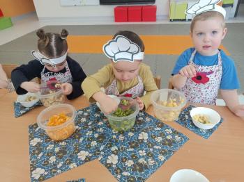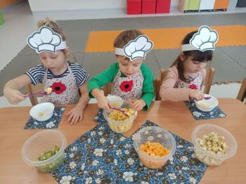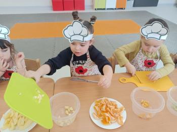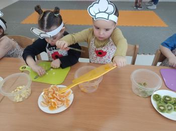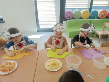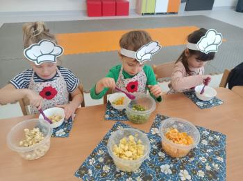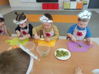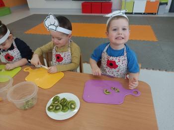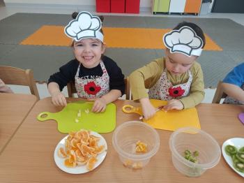 Dzieci z grupy Biedronki wykonywały w przedszkolu sałatkę owocową z wykorzystaniem jabłek, bananów, mandarynek i kiwi. Przedszkolaki poznały walory zdrowotne spożywania owoców. Bezpiecznie kroiły na desce wybrane owoce jak również komponowały swoją sałatkę z ulubionych owoców. Wszystkim smakował tak przygotowany deser.
