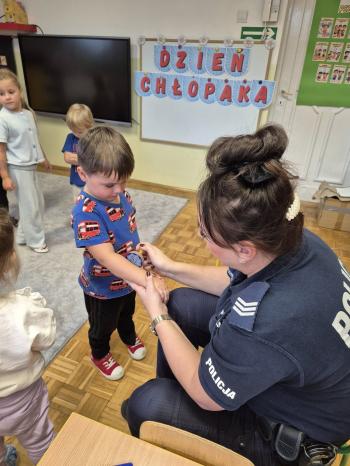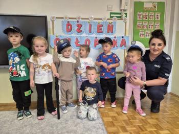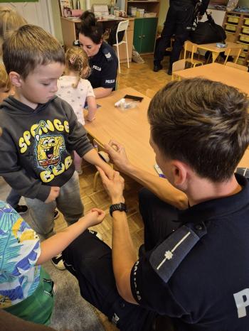 Tematem spotkania, równie ważnym jak bezpieczeństwo, było dla przedszkolaków poznanie tajników służby policjanta. Każde dziecko chciało obejrzeć z bliska kajdanki, lizak, a także przymierzyć policyjną czapkę. Było to bardzo udane spotkanie. Na zakończenie wszyscy uczestnicy spotkania wykonali z policjantami pamiątkowe zdjęcie.
