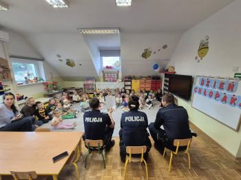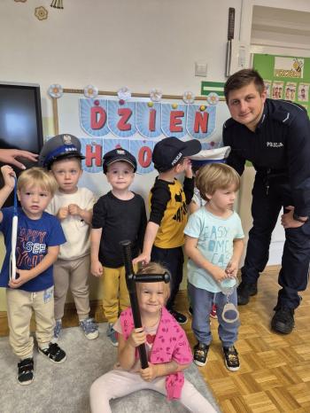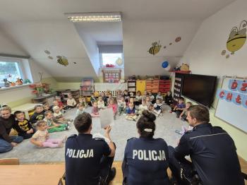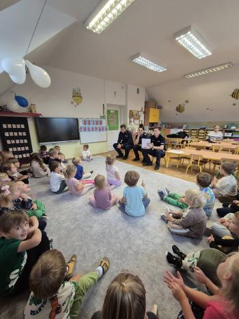 30 września w naszym przedszkolu odbyło się spotkanie z policjantem. Tematem spotkania było utrwalenie z dziećmi zasad ruchu drogowego oraz przypomnienie zagadnień dotyczących bezpieczeństwa dzieci w przedszkolu i w domu.