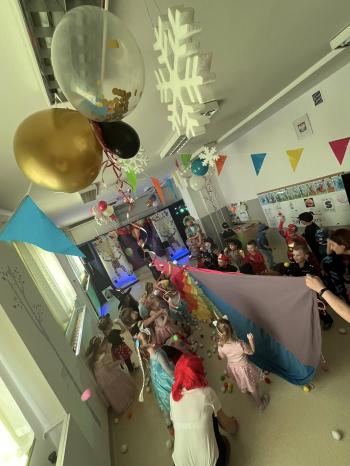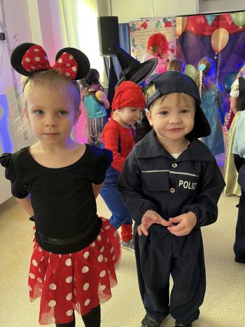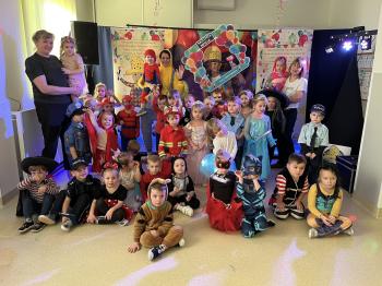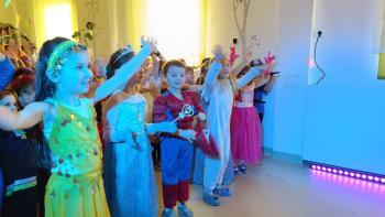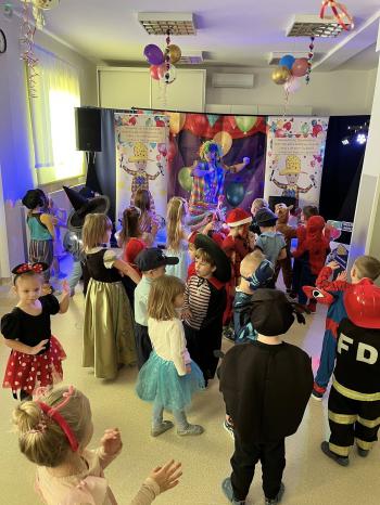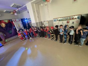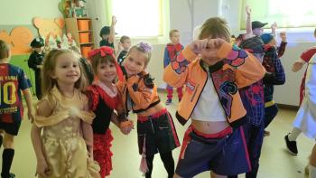 Tego dnia już od rana w przedszkolu pojawiały się kolorowe postacie.W salach przedszkolnych można było spotkać między innymi: wróżki, królewny, rycerzy, piratów, superbohaterów, nie sposób zliczyć i wymienić tych wszystkich postaci. Wystrój sali wprowadził w radosny nastrój oraz zachęcał wszystkich do wesołej zabawy. Kiedy pojawiły się pierwsze rytmy wesołej muzyki wszyscy z wielką ochotą rozpoczęli pląsy i tańce. Dzieci bawiły się znakomicie. A naszą wspaniałą zabawę umilił nam Pan Humorek.
