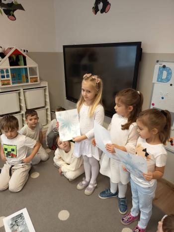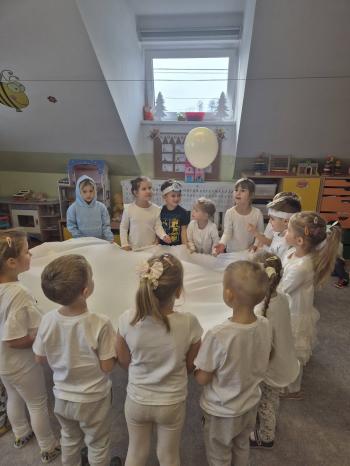 Dzieci z kazdej grupy w naszym przedszkolu obchodziły w styczniu ,,biały dzień „. Wspólnej wesołej zabawie towarzyszyły zimowe piosenki, konkursy i zagadki. Dzieci ubrane na biało chętnie brały udział we wszystkich konkurencjach i zbawach przygotowanych przez panie.
