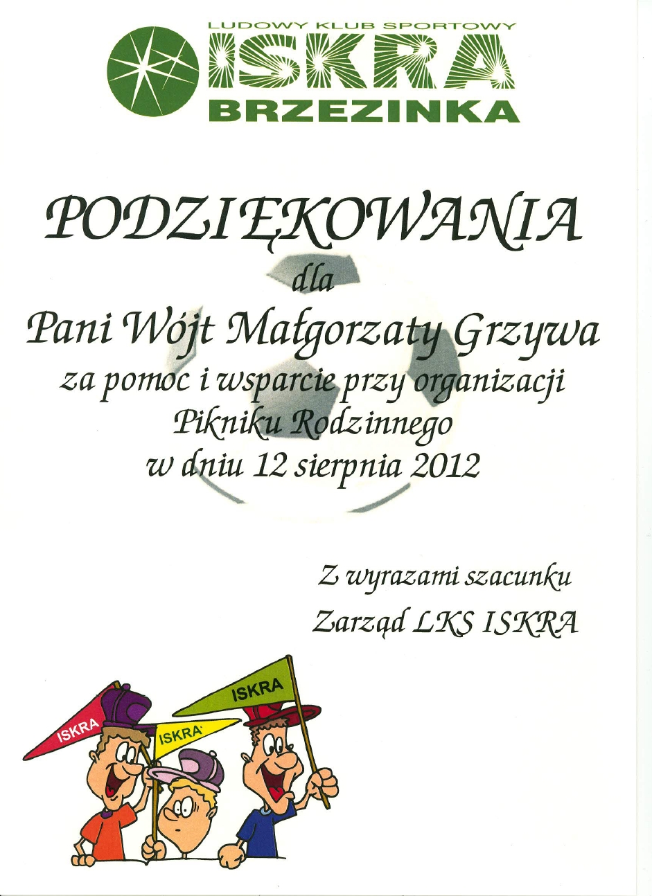 Podziękowanie za pomoc i wsparcie przy organizacji Pikniku Rodzinnego w dniu 12 sierpnia 2012 roku.