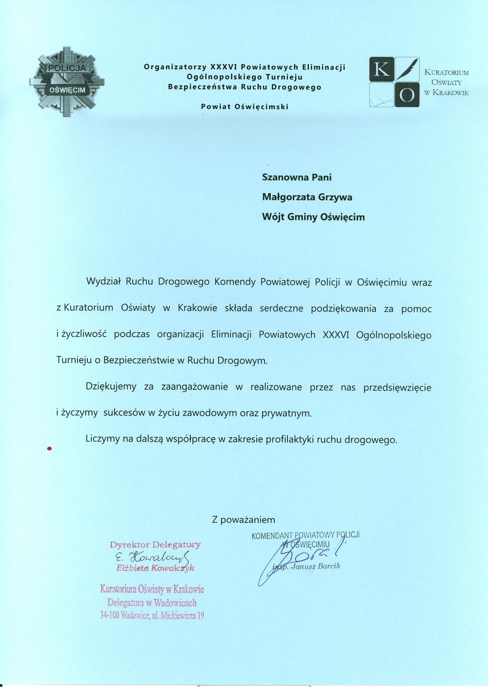 Czwartek, 13 czerwca 2013 Wydział Ruchu Drogowego Komendy Powiatowej Policji w Oświęcimiu wraz z Kuratorium Oświaty w Krakowie składa serdeczne podziękowanie za pomoc i życzliwość podczas organizacji Eliminacji Powiatowych XXXVI Ogólnegopolskiego Turnieju o Bezpieczeństwie w Ruchu Drogowym ...