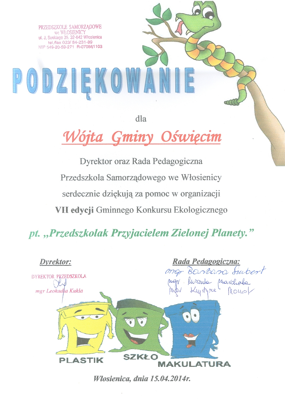 Środa, 16 kwietnia 2014 Podziękowanie za pomoc w organizacji VII edycji Gminnego Konkursu Ekologicznego pt. "Przedszkolak Przyjacielem Zielonej Planety ...