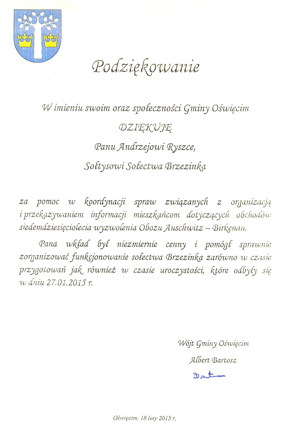 Środa, 18 lutego 2015 W imieniu swoim oraz społeczności Gminy Oświęcim Dziękuję Panu Andrzejowi Ryszce Sołtysowi Sołectwa Brzezinka za pomoc w koordynacji spraw związanych z organizacja i przekazywaniem informacji mieszkańcom dotyczących obchodów siedemdziesięciolecia wyzwolenia Obozu Auschwitz-Birkenau ....