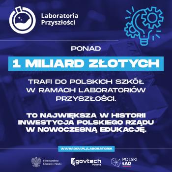 Laboratoria Przyszłości to inicjatywa edukacyjna realizowana przez Ministerstwo Edukacji i Nauki we współpracy z Centrum GovTech w Kancelarii Prezesa Rady Ministrów. Naszą wspólną misją jest stworzenie nowoczesnej szkoły, w której zajęcia będą prowadzone w sposób ciekawy, angażujący uczniów oraz sprzyjający odkrywaniu ich talentów i rozwijaniu zainteresowań.