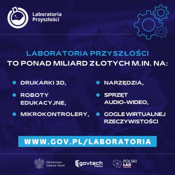 Laboratoria Przyszłości to Program skierowany do szkół podstawowych oraz ogólnokształcących szkół artystycznych. Jego celem jest budowanie kompetencji kreatywnych i technicznych wśród uczniów. W ramach Programu szkoły otrzymają od państwa wsparcie finansowe na zakup wyposażenia technicznego niezbędnego do rozwoju umiejętności praktycznych wśród dzieci i młodzieży.